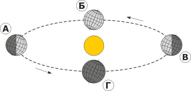 Якою буквою позначено місце Землі на орбіті в той час, коли в Україні найбільша тривалість світлового дня?