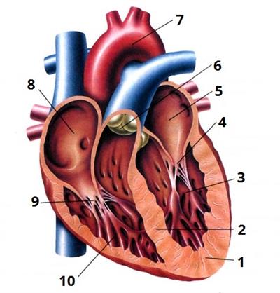 Визнач, під яким номером на зображенні серця представлено лівий шлуночок: