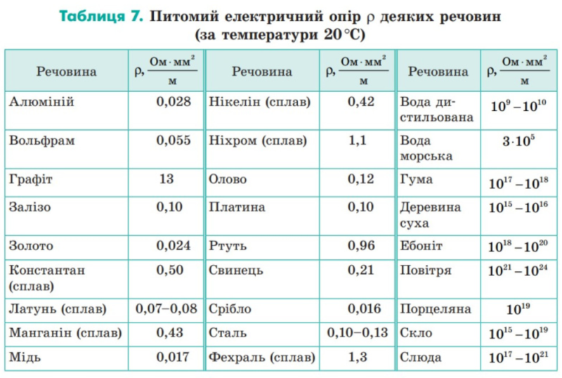 Використовуючи таблицю питомих електричних опорів, укажіть правильне розташування речовин у порядку зростання їх питомих опорів.