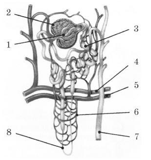 Реабсорбція відбувається в складових нефрону, які позначено цифрами