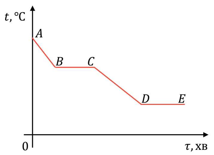 На малюнку зображено графік зміни температури від часу для речовини? Яка ділянка відповідає конденсації?