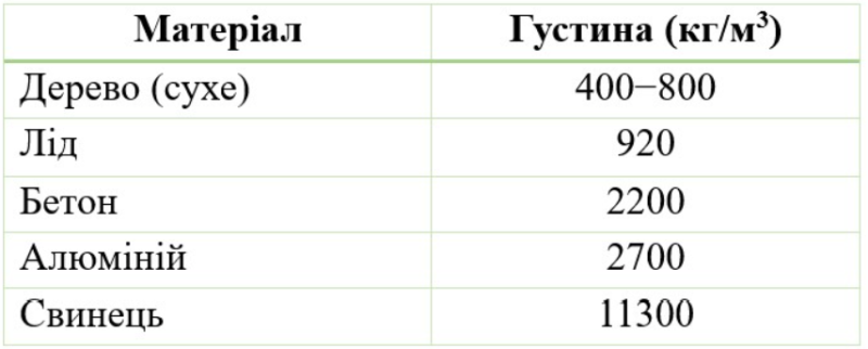 Густина деяких речовин: Вода – 1000 кг/м3, Олія соняшникова – 920 кг/м3, Гас – 800 кг/м3,