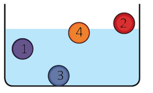 Три кульки однакового об’єму, виготовлені з різних матеріалів, повністю занурюють в рідину. Одна з кульок починає спливати на поверхню, друга починає тонути, третя залишається нерухомою всередині рідини. Визначте кульку, густина якої є найменшою.