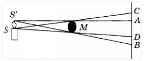 На рисунку зображено протяжне джерело світла SS' та екран, між якими знаходиться непрозоре тіло М. Якими буквами позначені межі тіні і півтіні цього тіла на екрані?
