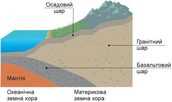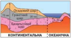 Розгляньте схематичний малюнок і виберіть відмінності материкової та океанічної земної кори (3)