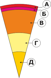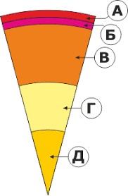 Знайдіть відповідність між назвами шарів внутрішньої будови Землі та буквами на схемі: