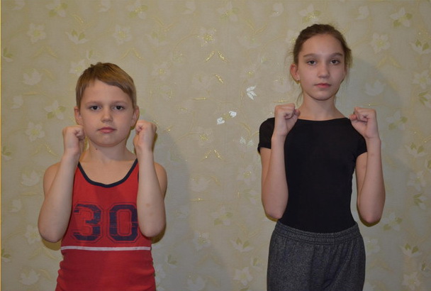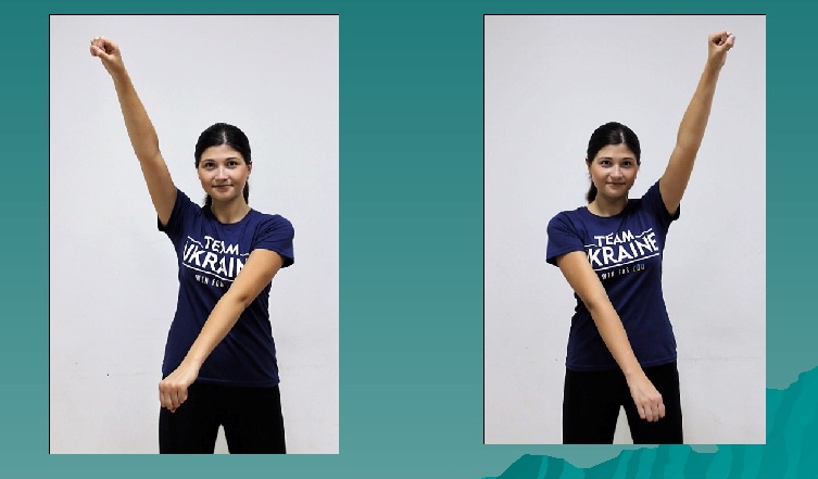 Як називається позиція при якій одна рука зігнута перед грудьми, а друга пряма в бік, кисті в кулак?