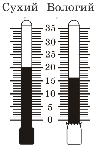 На рисунку зображений психрометр, установлений у кімнаті. Скориставшись даними рисунка та необхідними таблицями, визначте відносну вологість і абсолютну вологість повітря в кімнаті.