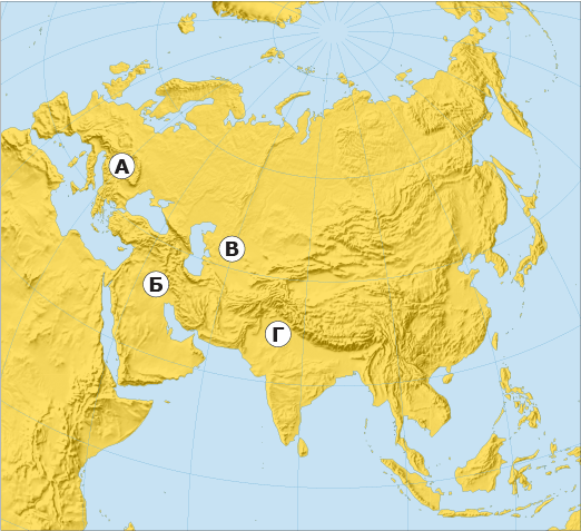 Встановіть відповідність між елементами рельєфу Євразії, які позначені на карті буквами та їх назвами.