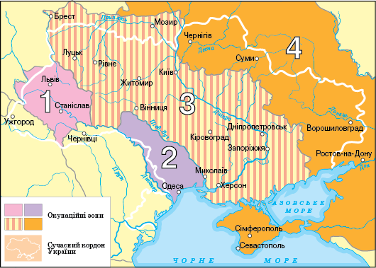 Установіть відповідність між пронумерованим на картосхемі адміністративним окупаційним утворенням часів Великої Вітчизняної війни (1941—1945 рр.) та його назвою й підпорядкуванням.