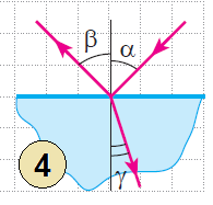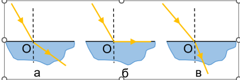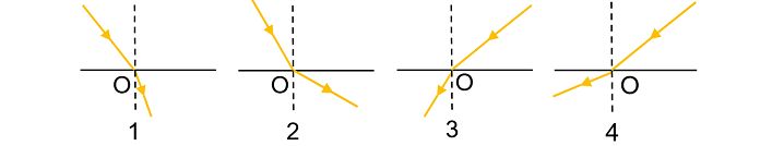 Світловий промінь, який падає з повітря на поверхню води, зазнає відбивання та заломлення. У якому з випадків на рисунку правильно показано відбитий і заломлений промені?