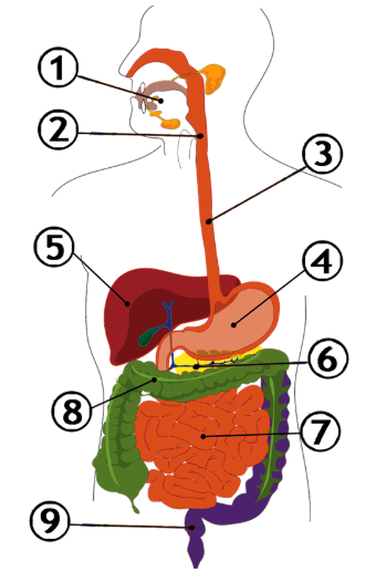 На малюнку: стравохід, тонку кишку, печінку, шлунок, пряму кишку позначено цифрами:
