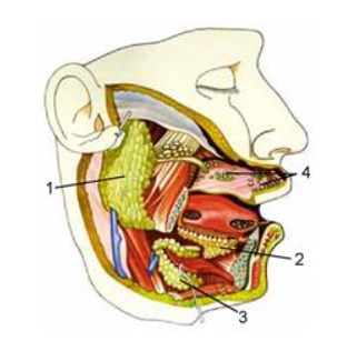 Піднижньощелепні залози на малюнку зображені цифрою ____. Основним ферментом слини є _____