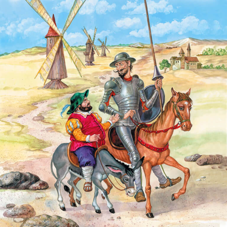 Приклад запитання: Що саме Дон Кіхот прийняв за «потворних велетнів» серед поля?