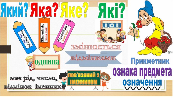 Приклад запитання: Прикметник- це частина мови.яка вказує на....