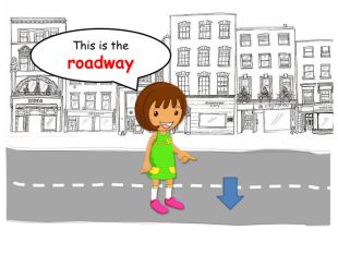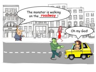 The monster is walking on the _________!roadway. Oh my God!rrrrr