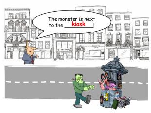The monster is next to the _________!kiosk