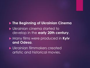 The Beginning of Ukrainian Cinema. Ukrainian cinema started to develop in the early 20th century. Many films were produced in Kyiv and Odesa. Ukrainian filmmakers created artistic and historical movies.