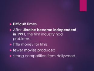 Difficult Times. After Ukraine became independent in 1991, the film industry had problems:little money for filmsfewer movies producedstrong competition from Hollywood.
