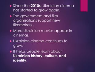 Since the 2010s, Ukrainian cinema has started to grow again. The government and film organizations support new filmmakers. More Ukrainian movies appear in cinemas. Ukrainian cinema continues to grow. It helps people learn about Ukrainian history, culture, and identity.