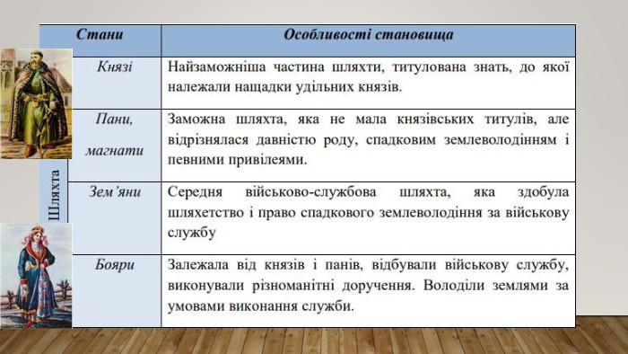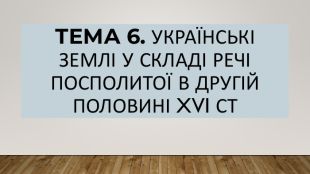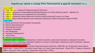 • дати подій:1556-1561 рр. - створення Пересопницького Євангелія; 1556 р .- заснування князем Дмитром Вишневецьким на о. Мала Хортиця першої - відомої Січі; 1569 р .- Люблінеька унія: утворення Речі Посполйтої; 1586 р .- утворення першої братської (слов'яно-греко-латинської) школи у м. Львів; 1596 р. - Берестейська церковна унія: утворення Української греко-католицької церкви (УГКЦ); • персоналії: Василь-Костянтин Костянтинович Острозький. Дмитра Вишневецького. Криштоф Косинський. Северин Наливайко,Іван Федорович. Герасима Смотрицького Іпатія Потія,Мелетія Смотрицького; • значення понять і термінів: «воєводство», «низове козацтво», «реєстрове козацтво», «городове козацтво», «Запорозька Січ», «старшина», «кошовий отаман», «гетьман», «клейноди», «Українська греко-католицька церква», «братство», «полемічна література»; • історично-культурні пам’ятки: мініатюри Пересопницького Євангелія- 1556-1561 рр.; Острозький замок: Кругла (Нова) вежа - кінець XVI ст.; ансамбль площі Ринок у м. Львів: Чорна Кам’яниця - кінець XVI ст., будинок Корнякта- 1580 р.; євангеліст Лука: гравюра з львівського «Апостола» -1574 р. Українські землі у складі Речі Посполитої в другій половині XVI ст