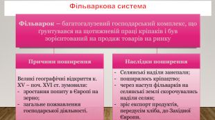 Фільваркова система. Фільварок – багатогалузевий господарський комплекс, що ґрунтувався на щотижневій праці кріпаків і був зорієнтований на продаж товарів на ринку Причини поширення. Наслідки поширення. Великі географічні відкриття к. ХV – поч. ХVІ ст. зумовили:зростання попиту в Європі на зерно;загальне пожвавлення господарської діяльності. Селянські наділи занепали;поширилось кріпацтво;через наступ фільварків на селянські землі скорочувались наділи селян;зріс експорт продуктів, передусім хліба, до Західної Європи.