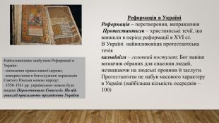 Реформація в УкраїніРеформація – перетворення, виправлення Протестантизм – християнські течії, що виникли в період реформації в XVI ст. В Україні найвпливовіша протестантська течіякальвінізм – головний постулат: Бог навіки визначив обраних для спасіння людей, незважаючи на людські провини й заслуги. Протестантизм не набув масового характеру в Україні (найбільша кількість осередків – 100)Найголовнішим здобутком Реформації в Україні:оновлення православної церкви;використання в богослужінні перекладів Святого Письма мовою народу;1556-1561 рр. українською мовою було видано Пересопницьке Євангеліє. На цій еванглії присягають президенти України