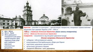 Дата – 1586 рік;Місто- Львів;Мета діяльності: поширення культурно-просвітницьких ідей; надання учням умов для глибокого вивчення різноманітних дисциплін;Братства – релігійні та культурно – просвітницькі товариства, створювані православними міщанами при церквах України в XV – XVI cт. 1586 р. – Львівське Успенське братство (мало власну ставропігію).1615 р. - Київське Богоявленське братство. Ставропігія – незалежність від місцевої церковної влади. Основі напрямки діяльності братств: побудова і обслуговування церквивлаштовування благодійницьких обідів для біднихпідготовка церковних урочистостейорганізація допомоги хворимстворення бібліотек і шкіл, друкарень