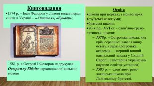 Книговидання1574 р. – Іван Федоров у Львові видав перші книги в Україні – «Апостол», «Буквар»;1581 р. в Острозі І. Федоров надрукував Острозьку Біблію церковнослов’янською мовою. Освіташколи при церквах і монастирях;єзуїтські колегіуми;братські школи;70-х рр.. XVI ст. - слов’яно-греко-латинські школи:1578р. – Острозька школа, яка крім середньої давала вищу освіту; (Зараз Острозька академія — перший вищий навчальний заклад у Східній Європі, найстарша українська науково-освітня установа)1585 р. – слов’яно-греко-латинська школа при Львівському братстві.