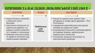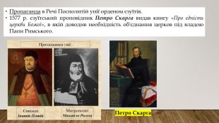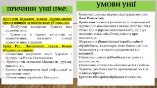 Умови уніїГреко-католицька церква підпорядковується Папі Римському. Прийнято догмати (основи віри) католицької церкви про походження Святого Духа від Бога Отця і Сина (православні вважають, що Дух походить тільки від Отця), вчення про чистилище. Збереження візантійської (православної) обрядовості, календаря, мови богослужіння. Звільнення уніатського духовенства від податків. Уніатська шляхта зрівнювалася в правах з католицькою. Уніатським єпископам обіцяно місця в сенаті. Чернече (монаше) життя організовувалося за східним обрядом. Братства підпорядковувалися єпископам. Причини бажання деяких православних представників духовенствадо об’єднання:- Позбутися контролю братств над духовенством.- Зрівняння в правах католиків та православних, посилити позиції православних в державі. Уряд Речі Посполитої також бажав об’єднання церков:-Остаточно закріпити землі України і Білорусі за Річчю Посполитою.-Припинити зазіхання Москви на «руську спадщину». Зупинити поширення ідей реформації та протестантизму. -Ополячення українців і білорусів.причини унії 1596р.