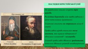 Наслідки Берестейської уніїНа українських землях існують три церкви. Релігійна боротьба між православними і греко-католиками (уніатами). Уніатські єпископи не отримали місця в сенаті. Православна церква опинилася поза законом, яка шукала підтримки в світських елементів – козацтва. Уніатів православні вважали зрадниками, католики вважали уніатів неповноцінними громадянами.