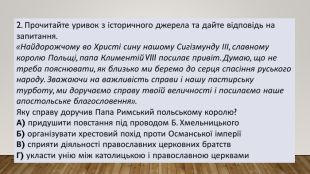2. Прочитайте уривок з історичного джерела та дайте відповідь на запитання.«Найдорожчому во Христі сину нашому Сигізмунду ІІІ, славному королю Польщі, папа Климентій VIII посилає привіт. Думаю, що не треба пояснювати, як близько ми беремо до серця спасіння руського народу. Зважаючи на важливість справи і нашу пастирську турботу, ми доручаємо справу твоїй величності і посилаємо наше апостольське благословення». Яку справу доручив Папа Римський польському королю?А) придушити повстання під проводом Б. Хмельницького. Б) організувати хрестовий похід проти Османської імперіїВ) сприяти діяльності православних церковних братств. Г) укласти унію між католицькою і православною церквами