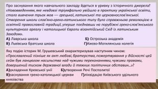 Про заснування якого навчального закладу йдеться в уривку з історичного джерела?«Нововведенням, яке невдовзі тріумфально увійшло в практику української освіти, стало вивчення трьох мов — грецької, латинської та церковнослов’янської. Створення школи слов’яно-греко-латинського типу було справжньою революцією в освітній православній традиції, уперше поєднавши на порубіжні греко-слов’янського культурного ареалу і католицької Європи візантійський Схід із латинським Заходом». А) Лаврська школа Б) Острозька академія. В) Львівська братська школа Г)Києво-Могилянська колегія. Яку подію історик М. Грушевський охарактеризував наступним чином:«Прославлений пізніше як акт любові, братерства, пожертвування у дійсності цей сейм був ланцюгом насильства над чужими переконаннями, чужими правами, довершений тиском державної влади й тяжких політичних обставин...»?А)укладення Кревської унії Б)утворення Речі ПосполитоїВ)заснування греко-католицької церкви Г)ліквідацію Київського удільного князівства