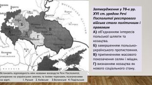 Встановіть відповідність між назвами воєводств Речі Посполитої, утворених на українських землях, та їхніми теренами, позначеними на карті. 1. Руське 2. Київське 3. Волинське 4. Подільське. Затвердження у 70-х рр. XVI ст. урядом Речі Посполитої реєстрового війська стало політичним і правовим. А) об’єднанням інтересів польської шляхти та козацтва. Б) завершенням польсько-українського протистояння. В) припиненням масового покозачення селян і міщан. Г) визнанням козацтва як нового соціального стану.