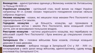 Воєводство - адміністративна одиниця у Великому князівстві Литовському та Польщі XV-XVIII ст. Українське козацтво - суспільний стан, який виник на півдні України наприкінці ХV ст. (слово «козак» тюркського походження означає «вільна озброєна людина»). Низове козацтво - козаки, які мешкали поза межами Речі Посполитої на підконтрольних Січі землях. Городове козацтво - це більшість козацтва, що проживала в прикордонних містах і землях Речі Посполитої, вела козацький спосіб життя, але не визнавалася польською владою. Реєстрове козацтво - частина українського козацтва, яка перебувала на військовій службі Речі Посполитої і була внесена до спеціальних списків-реєстрів. Запорозька Січ - головна військова база козаків, столиця козацької держави й сама держава. Кошовий отаман - виборна посада в Запорізькій Січі у XVI - XVIII ст.; зосереджував у своїх руках вищу військову, адміністративну, судову владу, очолював Кіш Запорізької Січі.