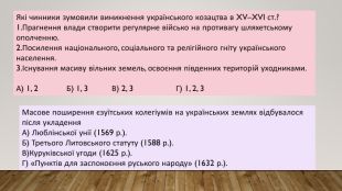 Які чинники зумовили виникнення українського козацтва в XV–XVI ст.?1. Прагнення влади створити регулярне військо на противагу шляхетському ополченню.2. Посилення національного, соціального та релігійного гніту українського населення.3.Існування масиву вільних земель, освоєння південних територій уходниками. А) 1, 2 Б) 1, 3 В) 2, 3 Г) 1, 2, 3 Масове поширення єзуїтських колегіумів на українських землях відбувалося після укладення. А) Люблінської унії (1569 р.). Б) Третього Литовського статуту (1588 р.). В)Куруківської угоди (1625 р.). Г) «Пунктів для заспокоєння руського народу» (1632 р.).