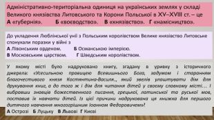 Адміністративно-територіальна одиниця на українських землях у складі Великого князівства Литовського та Корони Польської в XV–XVIII ст. – це. А «губернія». Б «воєводство». В «князівство». Г «намісництво». До укладення Люблінської унії з Польським королівством Велике князівство Литовське спонукали поразки у війні з. А Лівонським орденом. Б Османською імперією. В Московським царством. Г Шведським королівством. У якому місті було надруковано книгу, згадану в уривку з історичного джерела: «Усесильною правицею Всевишнього Бога, задумом і старанням благочестивого князя Костянтина-Василя.., який звелів улаштувати дім для друкування книг, а до того ж і дім для читання дітей у своєму славному місті… І вибравши знавців божественного писання, грецької, латинської та руської мов, поставив їх навчати дітей. Із цієї причини надрукована ця книжка для першого дитячого навчання многогрішним Іоанном Федоровичем»?А Острозі Б Луцьку В Львові Г Києві