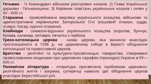 Гетьман - 1) Командувач військом реєстрових козаків. 2) Глава Української держави - Гетьманщини. 3) Керівник повстань українських козаків і селян у XV - XVIII ст. Старшина - привілейована верхівка українського козацтва, військове та адміністративне керівництво Запорозької Січі (кошовий отаман, суддя, осавул, писар, курінні отамани). Клейноди - символи-відзнаки українського козацтва (корогва, бунчук, булава, каламар, литаври, печатка з гербом). Греко-католицька церква - назва церкви, яка виникла внаслідок проголошеного в 1596 р. на церковному соборі в Бересті об’єднання католицької та православної церков. Братство - релігійні та культурно-просвітницькі товариства, створювані православними міщанами при церковних парафіях (приходах) України в XV—XVII ст. Полемічна література - література присвячена проблемам церковно-релігійного життя і зокрема, суперечці навколо ідеї об’єднання церков унаслідок Берестейської унії.