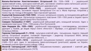 Василь-Костянтин Констянтинович Острозький (бл. 1526—1608 ) - український православний князь, культурно-освітній діяч, засновник слов’яно-греко-латинської школи і друкарні в Острозі, противник Берестейської церковної унії. Дмитро Вишневецький (1516—1563) - український православний князь, перший козацький гетьман, засновник першої Запорозької Січі на о. Мала Хортиця, потрапив у полон під час походу в Молдавію і був страчений турками. Кшиштоф Косинський (1545-1593) - гетьман запорізьких козаків, за походженням дрібний шляхтич з Підляшшя. Організатор козацького повстання 1591–1593 років в Україні проти шляхти й урядової адміністрації Речі Посполитої. Северин Наливайко (?-1597) - український військовий діяч, козацький ватажок. Один з керівників повстання 1594—1596 років у Речі Посполитій.Іван Федоров (бл. 1525—1583) - український першодрукар і книговидавець, засновник друкарні у Львові, де видав перші книги «Апостол» і «Буквар», а в друкарні Острога — Острозьку Біблію. Герасим Смотрицький (?—1514) - культурно-освітній діяч, письменник, педагог, перший ректор Острозької академії, головний перекладач і редактор Острозької біблії, автор полемічного твору «Ключ царства небесного...».Іпатій Потій (1541—1613) - український письменник-полеміст, уніатський митрополит (1600—1613 рр.), один iз засновникiв греко-католицької (унiатської) церкви на Українi, активний учасник Брестського собору 1596 р. Мелетій Смотрицький (1577-1633) - письменник-полеміст, церковний і освітній діяч, автор «Граматики слов'янської» (1619).