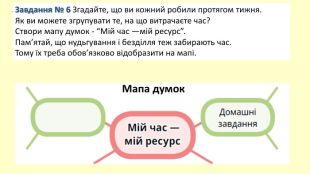 . Завдання № 6 Згадайте, що ви кожний робили протягом тижня. Як ви можете згрупувати те, на що витрачаєте час? Створи мапу думок - “Мій час —мій ресурс”. Пам’ятай, що нудьгування і безділля теж забирають час. Тому їх треба обов’язково відобразити на мапі. Мапа думок