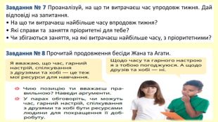 Завдання № 7 Проаналізуй, на що ти витрачаєш час упродовж тижня. Дай відповіді на запитання.• На що ти витрачаєш найбільше часу впродовж тижня?• Які справи та заняття пріоритетні для тебе?• Чи збігаються заняття, на які витрачаєш найбільше часу, з пріоритетними?Завдання № 8 Прочитай продовження бесіди Жана та Агати.