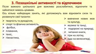 3. Позашкільні активності та відпочинок. Після важкого шкільного дня важливо розслабитися, відпочити та зайнятися чимось цікавим. Ось кілька найкращих занять, які допоможуть вам відновити сили та розвинути свої таланти: вивчення нових мов та культур,музика та танці, подорожі на природі, читання книги,ігри на логіку,їзда на велосипеді,творчість та рукоділля,спорт та фізична активність, футбол,плавання,теніс,гімнастика,
