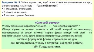 Завдання № 9 Зміни фрази так, щоб вони стали спрямованими на дію, скориставшись пам’яткою “Сам собі ресурс”.• Я втомився / втомилася.• Я нічого не встигаю.• Я не знаю правил безпеки.«Сам собі ресурс»У чому різниця між фразами “я змерз і “мені треба зігрітися”? Обидві фрази ти можеш сказати в тій самій ситуації — наприклад, повернувшись зі школи взимку. Перша фраза описує твій стан і не передбачає дію. А ось друга виражає потребу в дії, готовність до неї. Частіше формулюй фрази, спрямовані на дію. Так ти усвідомиш, у чому є потреба і що треба робити, аби її задовольнити.