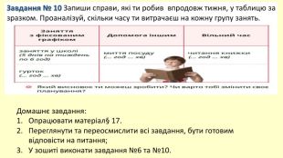 Завдання № 10 Запиши справи, які ти робив впродовж тижня, у таблицю за зразком. Проаналізуй, скільки часу ти витрачаєш на кожну групу занять. Домашнє завдання: Опрацювати матеріал§ 17. Переглянути та переосмислити всі завдання, бути готовим відповісти на питання;У зошиті виконати завдання №6 та №10.