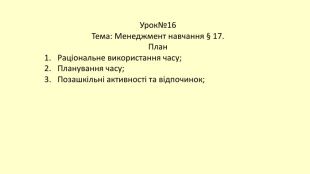 Урок№16 Тема: Менеджмент навчання § 17. План. Раціональне використання часу;Планування часу;Позашкільні активності та відпочинок;