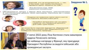 У липні 2022 року Ліна Костенко стала кавалером ордена Почесного легіону. Це найвища нагорода у Франції, яку присуджує Президент Республіки за видатні військові або громадянські заслуги. Завдання № 1.