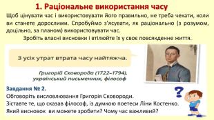 1. Раціональне використання часу. Щоб цінувати час і використовувати його правильно, не треба чекати, коли ви станете дорослими. Спробуймо з’ясувати, як раціонально (з розумом, доцільно, за планом) використовувати час. Зробіть власні висновки і втілюйте їх у своє повсякденне життя. Завдання № 2. Обговоріть висловлювання Григорія Сковороди. Зіставте те, що сказав філософ, із думкою поетеси Ліни Костенко. Який висновок ви можете зробити? Чому час важливий?