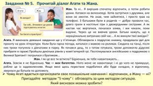 Завдання № 5. Прочитай діалог Агати та Жана. Жан. Та ні… Я вирішив спочатку відпочити, а потім робити уроки. Катався на велосипеді. Хотів зустрітися з друзями, але вони не змогли. Не знав, чим зайнятися, і просто грав на телефоні. З батьками були в родичів — добре провели час, довго грали в настільні ігри з двоюрідними сестрами. А як настав час вертатися, почалася злива, і ми чекали, поки вщухне. Через це не вивчив уроки. Батьки кажуть, що я нераціонально витрачаю свій час... А як минули твої вихідні?Агата. Я виконала домашні завдання ще у п’ятницю. Обговорила з подругою книжку, продумала ідеї для проєкту на урок літератури. Коли була гарна погода, каталася з мамою на роликах. Сходила на танці, після них трохи погуляла з дівчатами в парку. Як почався дощ, то з татом готувала, трохи допомогла дідусеві прибрати в гаражі. Пройшла декілька рівнів у комп’ютерній грі. Поспілкувалася англійською з подружкою з Великої Британії і погралася з братиком…Жан. І як це все ти встигла? Бідненька, як тебе навантажують... Агата. Зовсім я не бідненька. Час — моє багатство. Ніхто мене не навантажує і ні до чого не примушує, роблю це із задоволенням. Якщо мені щось перестане подобатися або буде складно, я відпочину, звернуся до батьків по допомогу. Чому Агаті вдається організувати своє позашкільне навчання і відпочинок, а Жану — ні? Пригадайте методом “5 чому” і обговоріть за цим методом ситуацію. Який висновок можна зробити?