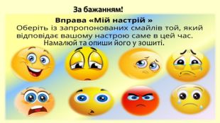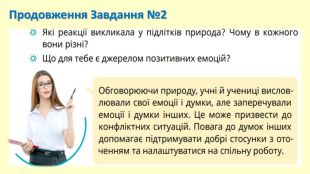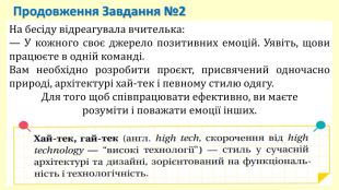 На бесіду відреагувала вчителька:— У кожного своє джерело позитивних емоцій. Уявіть, щови працюєте в одній команді. Вам необхідно розробити проєкт, присвячений одночасно природі, архітектурі хай-тек і певному стилю одягу. Для того щоб співпрацювати ефективно, ви маєте розуміти і поважати емоції інших. Продовження Завдання №2