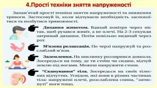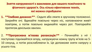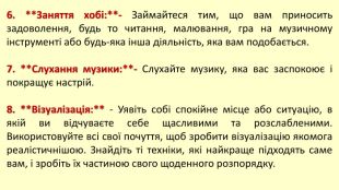 6. **Заняття хобі:**- Займайтеся тим, що вам приносить задоволення, будь то читання, малювання, гра на музичному інструменті або будь-яка інша діяльність, яка вам подобається.7. **Слухання музики:**- Слухайте музику, яка вас заспокоює і покращує настрій.8. **Візуалізація:** - Уявіть собі спокійне місце або ситуацію, в якій ви відчуваєте себе щасливими та розслабленими. Використовуйте всі свої почуття, щоб зробити візуалізацію якомога реалістичнішою. Знайдіть ті техніки, які найкраще підходять саме вам, і зробіть їх частиною свого щоденного розпорядку.